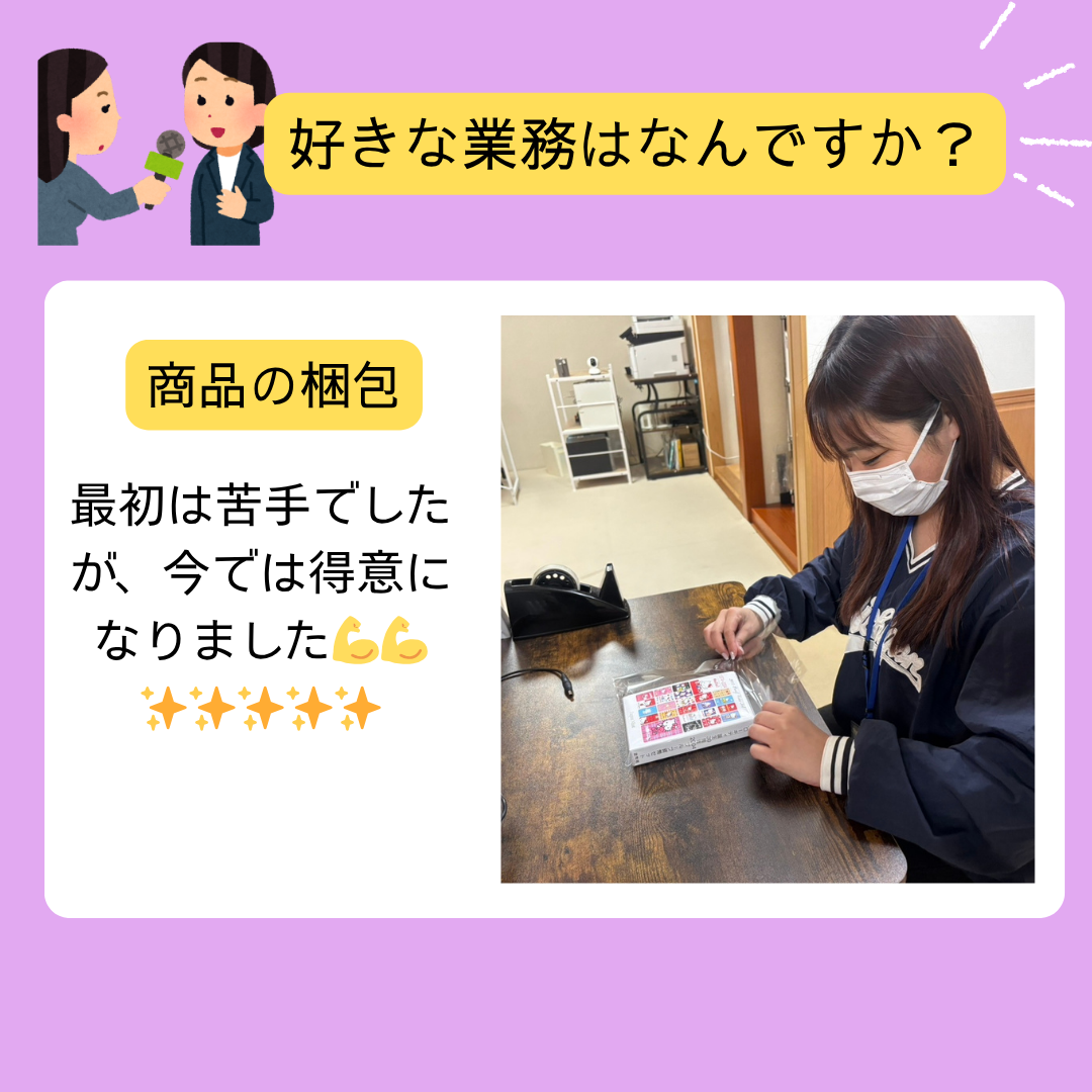 商品の梱包作業📦最初はなかなか上手くできず苦手な作業だったようですが、練習を重ねて上達したのだそうです!
