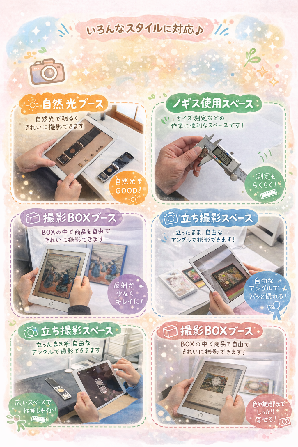 自然光で撮影される方、BOXや立ちスペースで撮影される方など、さまざまなスタイルに対応できる環境になっています📷