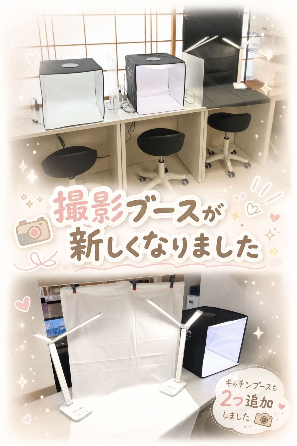 さらに、キッチンブースも2つ追加しています📸✨利用者さんの増加に伴い、作業場の左右に撮影ブースを設置し、人数が増えた際の混雑を防げるよう、2か所に増設しました。